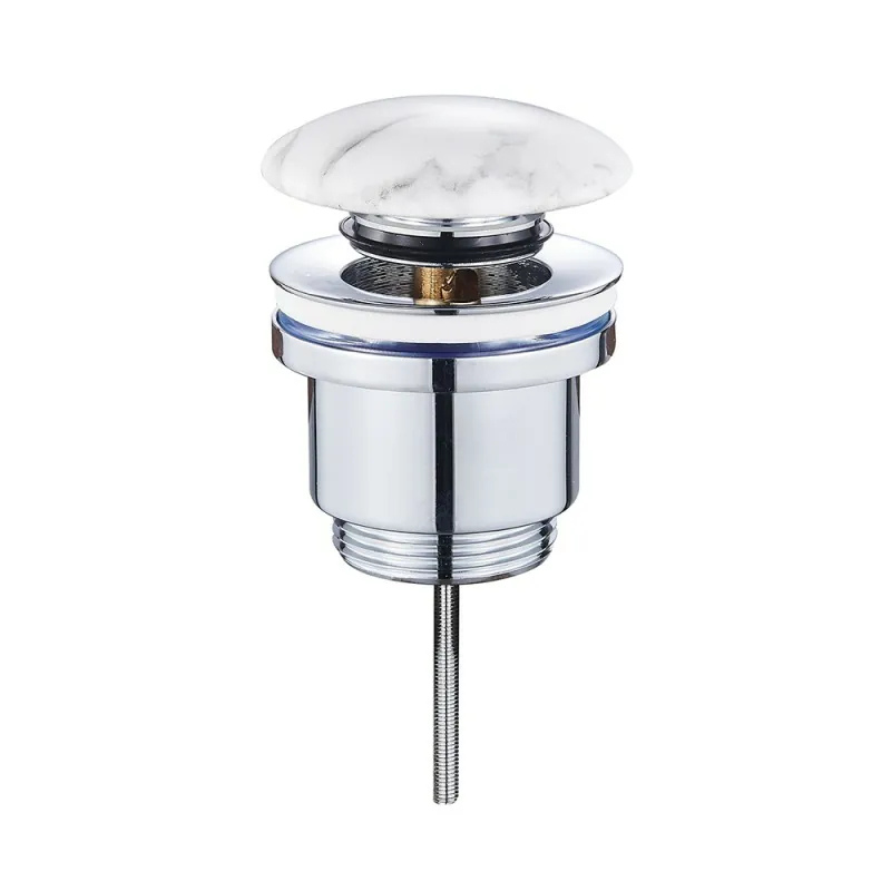Piletta di scarico tonda in acciaio e tappo in ceramica colore bianco effetto marmo, con sistema di apertura e chiusura manuale a pressione, con attacchi universali  1" 1/4, per lavabi e bidet con e senza troppopieno.