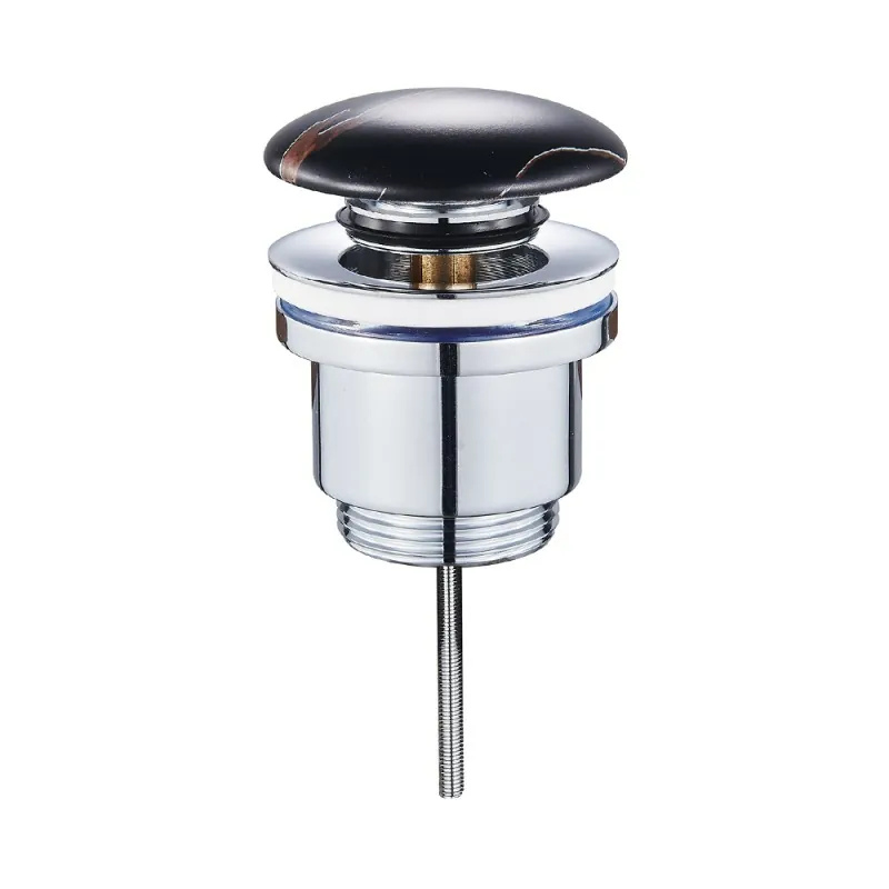 Piletta di scarico tonda in acciaio e tappo in ceramica colore nero effetto marmo, con sistema di apertura e chiusura manuale a pressione, con attacchi universali  1" 1/4, per lavabi e bidet con e senza troppopieno.