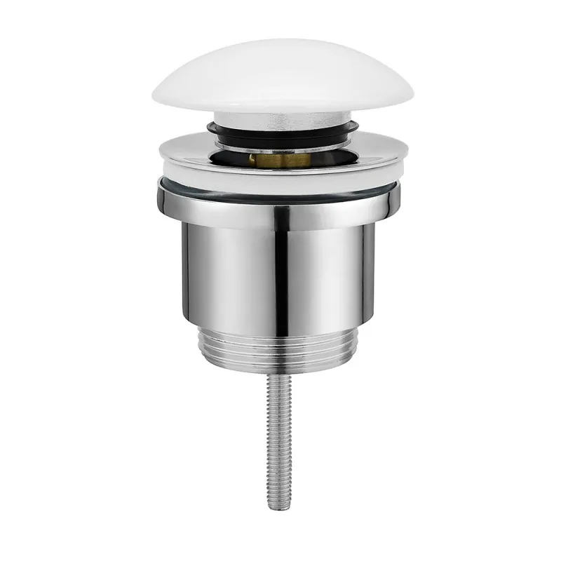 Piletta di scarico tonda in acciaio e tappo in ceramica colore bianco lucido, con sistema di apertura e chiusura manuale a pressione, con attacchi universali  1" 1/4, per lavabi e bidet con e senza troppopieno.