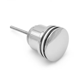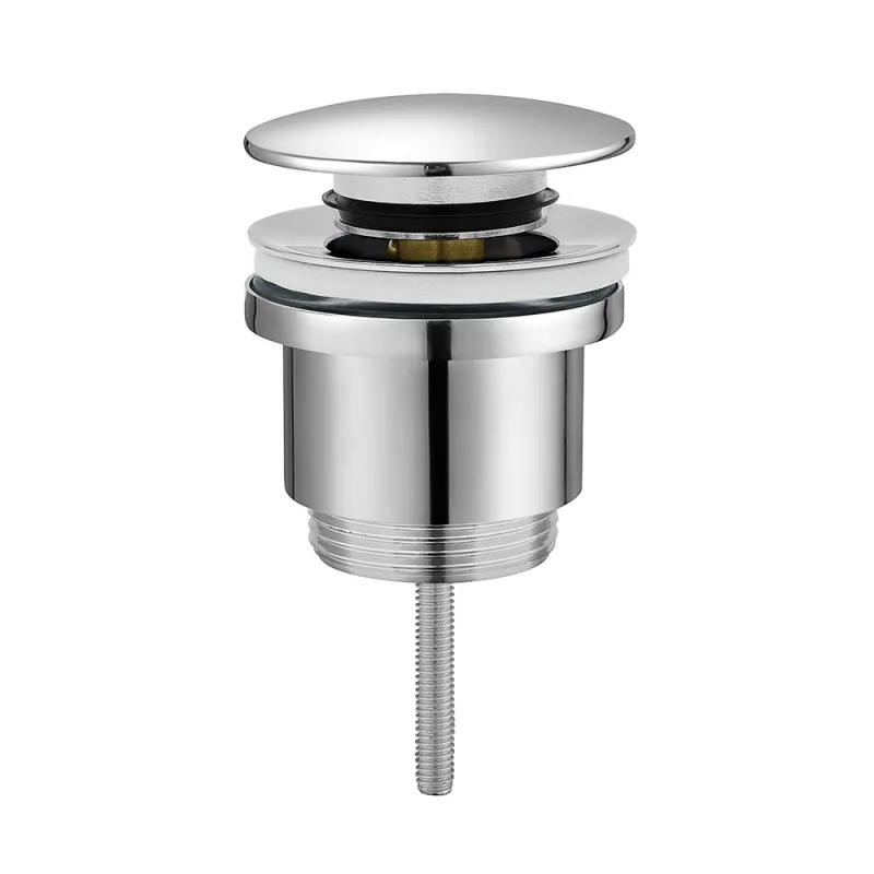 Piletta di scarico tonda in acciaio con tappo cromato, con sistema di apertura e chiusura manuale a pressione, con attacchi universali  1" 1/4, per lavabi e bidet con e senza troppopieno.