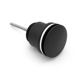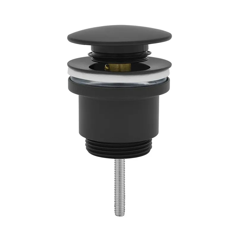 Piletta di scarico tonda in acciaio con tappo colore nero opaco, con sistema di apertura e chiusura manuale a pressione, con attacchi universali  1" 1/4, per lavabi e bidet con e senza troppopieno.