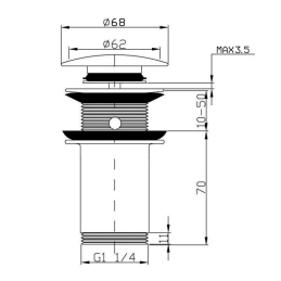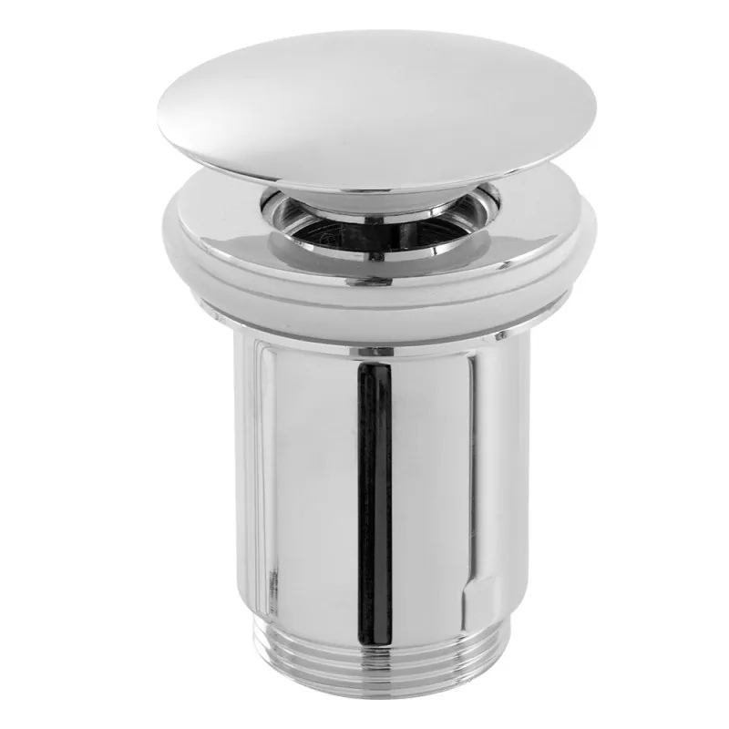 Piletta di scarico tonda in acciaio cromato senza troppo pieno, con sistema di apertura e chiusura manuale a pressione, con attacchi universali  1" 1/4 compatibili con la maggior parte dei lavabi e bidet in circolazione.