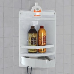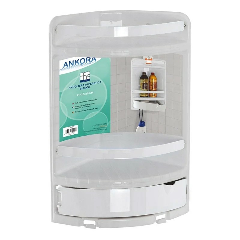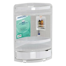 Angoliera per doccia in plastica a due ripiani e un cassetto di colore bianco. Linea Ankora