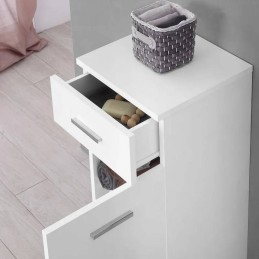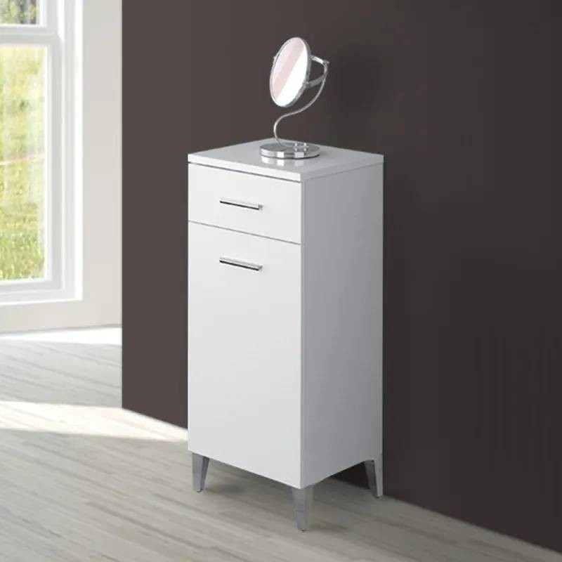 Base colonna singola a terra da bagno in legno melaminico colore bianco lucido con 1 anta reversibile e 1 cassetto, con piedini in ABS silver.