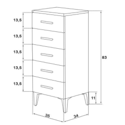Base colonna singola a terra da bagno in legno melaminico colore bianco lucido con 5 cassetti, con piedini in ABS silver. N.B. Mobiletto da completare con pensile acquistabile separatamente, vedi immagine, segui descrizione.