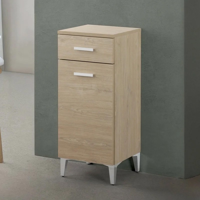 Base colonna singola a terra da bagno in legno melaminico colore larice con 1 anta reversibile e 1 cassetto, con piedini in ABS silver. N.B. Mobiletto da completare con pensile acquistabile separatamente, vedi immagine, segui descrizione.