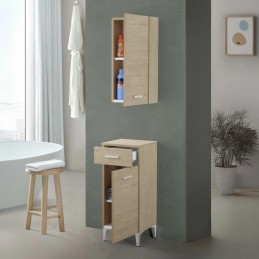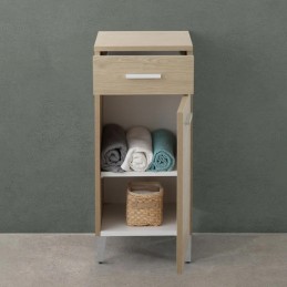Mobiletto multiuso da bagno in legno melaminico colore rovere chiaro con 2 ante con sistema slow motion e 1 cassetto con sistema soft-close, comodo e funzionale nella stanza da bagno per accessori e oggetti.