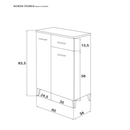 Completo di 2 ante, 1 cassetto, 2 mensole regolabili in altezza, 4 piedini e 3 maniglie in ABS cromato lucido.