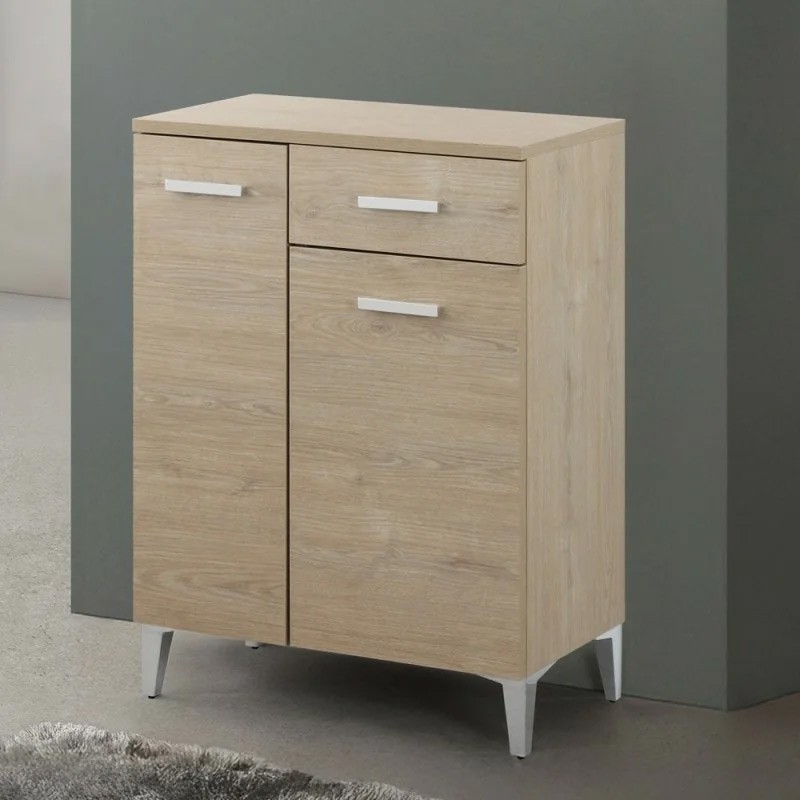 Mobiletto multiuso da bagno in legno melaminico colore rovere chiaro con 2 ante con sistema slow motion e 1 cassetto con sistema soft-close, comodo e funzionale nella stanza da bagno per accessori e oggetti.