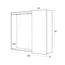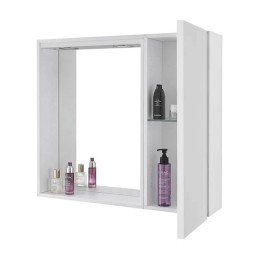 Specchiera da bagno in legno melaminico colore bianco laccato completa di 2 faretti a led integrati e con 1 anta contenitore laterale con mensola portaoggetti in vetro all'interno.