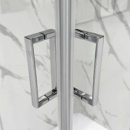 Cabina doccia 80x80 in vetro con porte scorrevoli trasparenti in cristallo temperato da 5mm di spessore. Le ante sono dotate di chiusura magnetica e di sgancio rapido. La struttura del box doccia è composta da un profilo in alluminio cromato lucido con possibilità di regolazione per pareti fuori squadro.