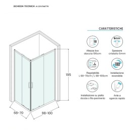 Cabina doccia 70x90 in vetro con porte scorrevoli trasparenti in cristallo temperato da 5mm di spessore con possibilità di installazione reversibile per un'apertura sia da destra che da sinistra. Le ante sono dotate di chiusura magnetica e di sgancio rapido. La struttura del box doccia è composta da un profilo in alluminio cromato lucido con possibilità...