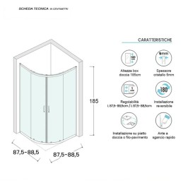 Cabina doccia semicircolare 90x90 in vetro con porte scorrevoli trasparenti di cristallo temperato da 5mm di spessore. Le ante sono dotate di chiusura magnetica e sgancio rapido. La struttura del box doccia è composta da un profilo in alluminio cromato lucido con possibilità di regolazione per pareti fuori squadro.
