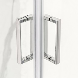 Cabina doccia 80x80 in vetro con porte scorrevoli trasparenti in cristallo temperato da 5mm di spessore. Le ante sono dotate di chiusura magnetica e di sgancio rapido. La struttura del box doccia è composta da un profilo in alluminio cromato lucido con possibilità di regolazione per pareti fuori squadro.