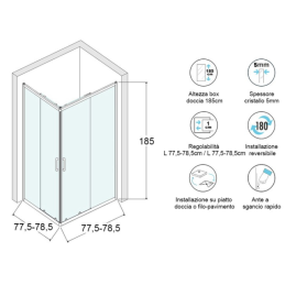Cabina doccia 80x100 in vetro con porte scorrevoli trasparenti in cristallo temperato da 5mm di spessore con possibilità di installazione reversibile per un'apertura sia da destra che da sinistra. Le ante sono dotate di chiusura magnetica e di sgancio rapido. La struttura del box doccia è composta da un profilo in alluminio cromato lucido con possibilità...