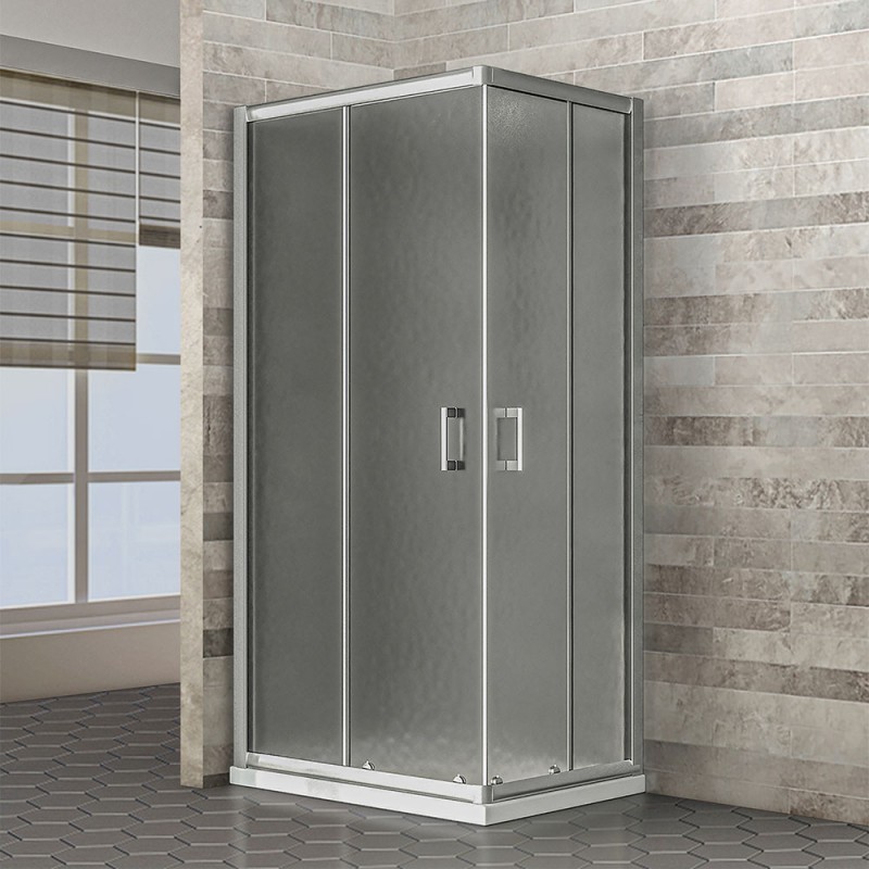 Cabina doccia 80x80 in vetro opaco con porte scorrevoli in cristallo temperato da 5mm di spessore. Le ante sono dotate di chiusura magnetica e di sgancio rapido. La struttura del box doccia è composta da un profilo in alluminio cromato lucido con possibilità di regolazione per pareti fuori squadro.
