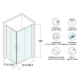 Cabina doccia 80x100 in vetro con porte scorrevoli trasparenti in cristallo temperato da 5mm di spessore con possibilità di installazione reversibile per un'apertura sia da destra che da sinistra. Le ante sono dotate di chiusura magnetica e di sgancio rapido. La struttura del box doccia è composta da un profilo in alluminio cromato lucido con possibilità...
