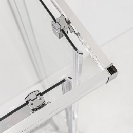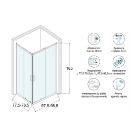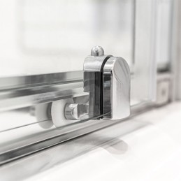 Cabina doccia 80x100 in vetro con porte scorrevoli trasparenti in cristallo temperato da 5mm di spessore con possibilità di installazione reversibile per un'apertura sia da destra che da sinistra. Le ante sono dotate di chiusura magnetica e di sgancio rapido. La struttura del box doccia è composta da un profilo in alluminio cromato lucido con possibilità di regolazione per pareti fuori squadro.