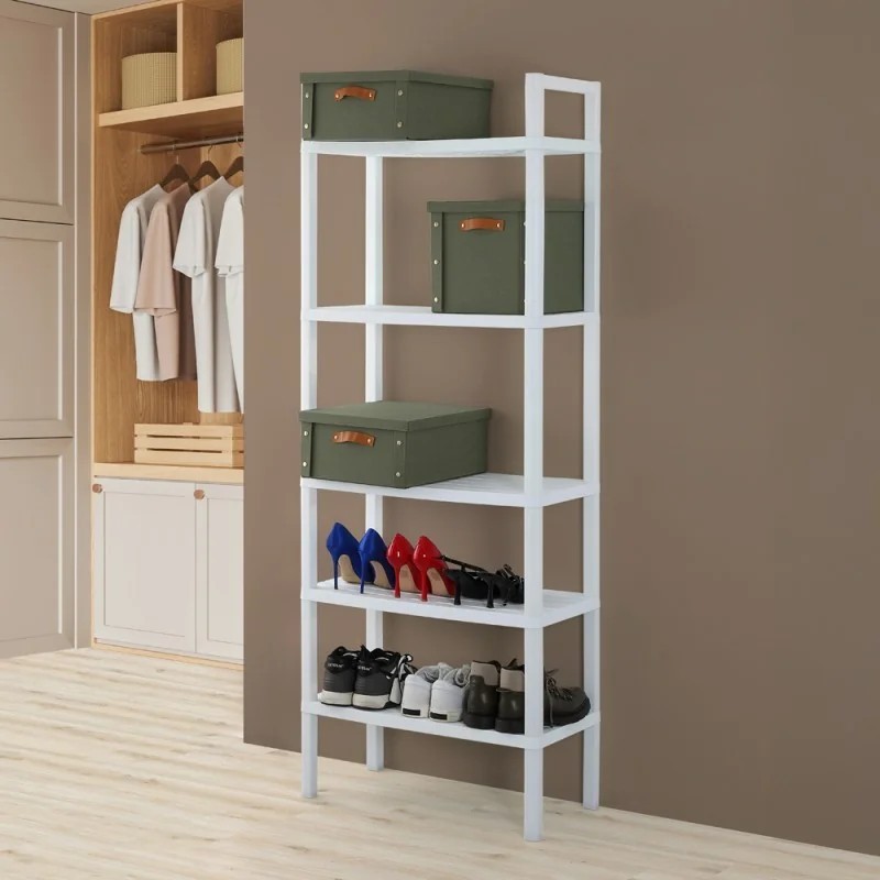 Scaffale multiuso salvaspazio in plastica di colore bianco a 5 ripiani fornito in kit di montaggio facile da assemblare.