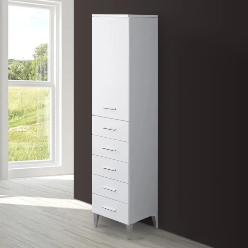 Colonna Armadio Portasciugamani a terra in legno melaminico colore bianco lucido con 1 anta e 5 cassetti, con 4 piedini in ABS silver.