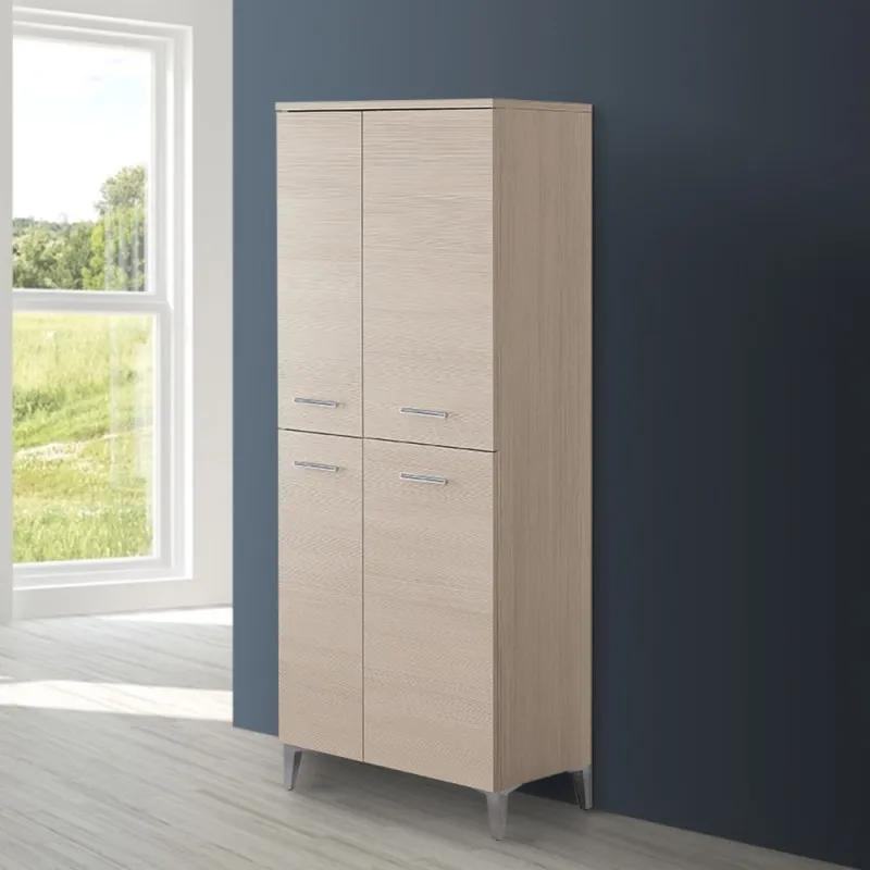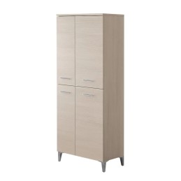 Mobile colonna armadio portasciugamani da terra in legno melaminico colore rovere chiaro con 4 ante e 1 cassetto centrale con sistema soft-close, perfetto per riporre accessori di uso quotidiano e rendere la stanza da bagno più funzionale.