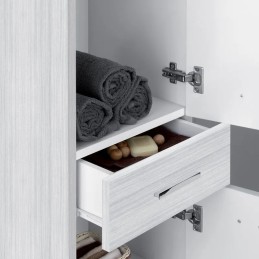 Colonna Armadio Portasciugamani a terra in legno melaminico colore bianco laccato con 2 ante con sistema slow motion per una chiusura ottimale, 2 ripiani interni removibili e regolabili, 1 cassetto con sistema soft-close e vano a giorno, con 4 piedini in ABS silver.