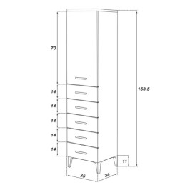 Colonna Armadio Portasciugamani a terra in legno melaminico colore bianco lucido con 1 anta e 5 cassetti, con 4 piedini in ABS silver.