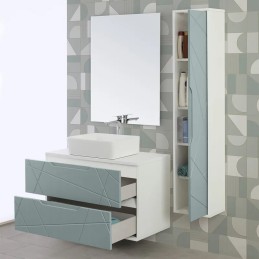Mobile bagno 90cm sospeso in legno melaminico bianco con frontali color verde salvia composto da mobiletto dotato di 2 cassetti con sistema soft-close per una chiusura ottimale, lavabo in ceramica lucida e specchio su telaio 70x90 cm. ATTENZIONE PENSILE LATERALE NON INCLUSO, acquistabile separatamente segui descrizione.