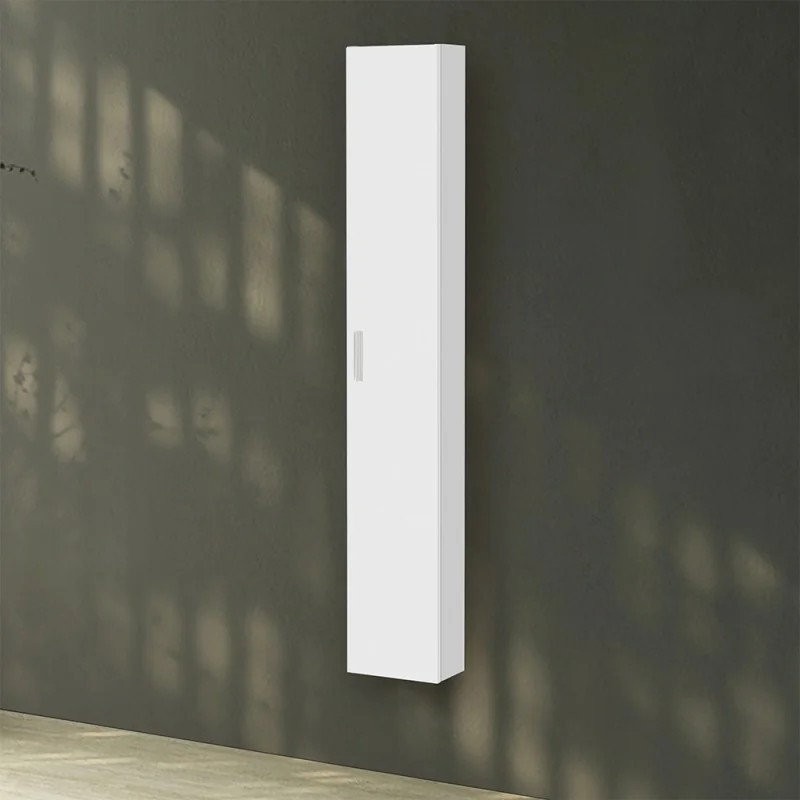 Pensile sospeso a parete in legno melamminico in Bianco Lucido con 1 anta lunga reversibile e 4 ripiani interni fissi.