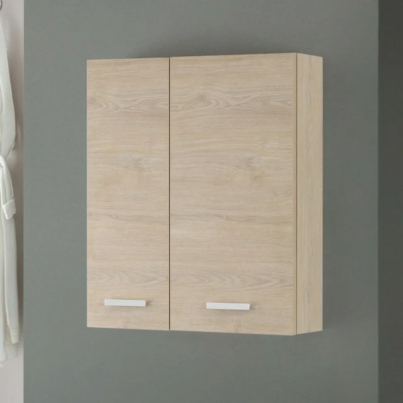 Pensile da bagno sospeso a parete in legno melaminico colore rovere chiaro con 2 ante senza maniglie con sistema di apertura push-pull e chiusura slow-motion per una chiusura ottimale, con 1 ripiano regolabile, con staffe per fissaggio a muro incluse.