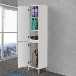 Colonna Armadio Portabiancheria a terra in legno melaminico colore bianco laccato con 2 ante reversibili con sistema slow motion per una chiusura ottimale , vano inferiore con cesta portabiancheria e vano superiore con 2 mensole regolabili portaoggetti, con 4 piedini in ABS silver.