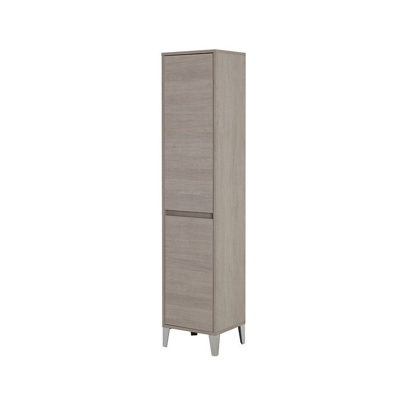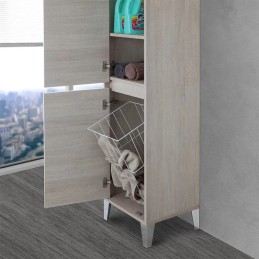 Colonna Armadio Portabiancheria a terra in legno melaminico colore rovere chiaro con 2 ante reversibili con sistema slow motion per una chiusura ottimale , vano inferiore con cesta portabiancheria e vano superiore con 2 mensole regolabili portaoggetti, con 4 piedini in ABS silver.