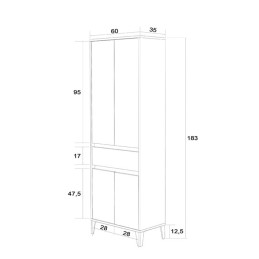 Colonna Armadio Portasciugamani a terra in legno melaminico colore bianco laccato con 2 ante con sistema slow motion per una chiusura ottimale, 2 ripiani interni removibili e regolabili, 1 cassetto con sistema soft-close e vano a giorno, con 4 piedini in ABS silver.