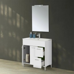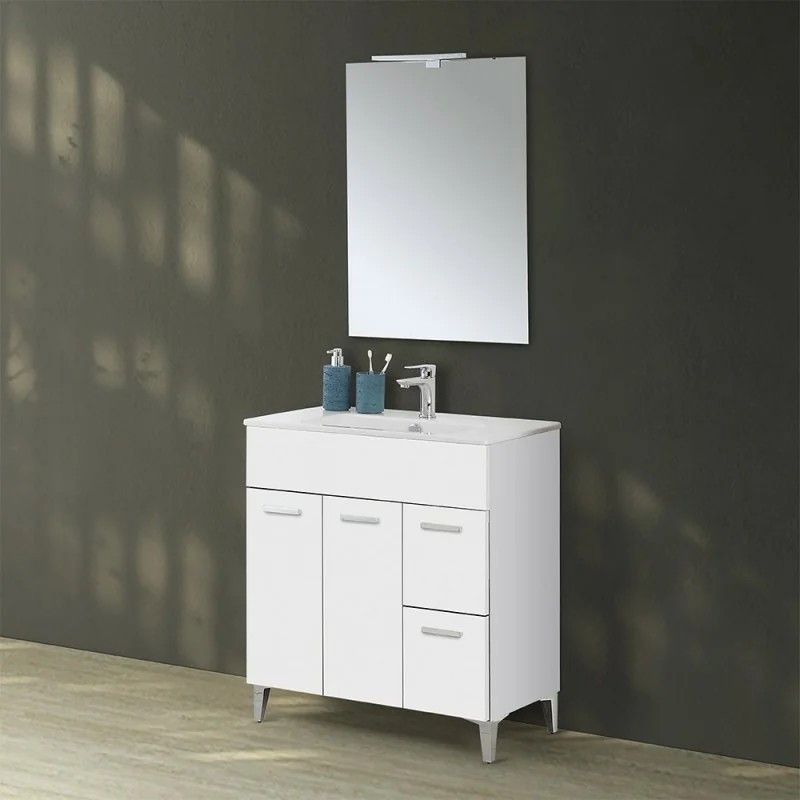 Mobile bagno 81cm a terra in legno melaminico bianco lucido composto da mobile dotato di 2 ante, 2 cassetti, lavabo in ceramica lucida e specchio 76x104 cm con pensile e illuminazione integrati.