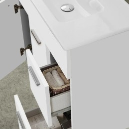 La collezione offre soluzioni complete e già assemblate, disponibili anche nella variante bianco lucido, e abbinabile a un pensile sospeso con quattro scomparti interni.