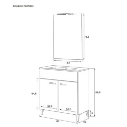 Mobile bagno 55 cm a terra in legno melaminico in Rovere dolomite. Composto da mobiletto con piedini in ABS dotato di 2 ante, lavabo a incasso in ceramica lucida e specchio reversibile.