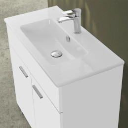 Mobile bagno 81cm a terra in legno melaminico bianco lucido composto da mobile dotato di 2 ante, 2 cassetti, lavabo in ceramica lucida e specchio 76x104 cm con pensile e illuminazione integrati.