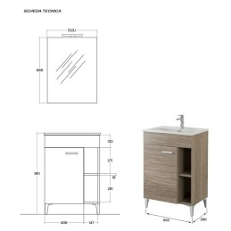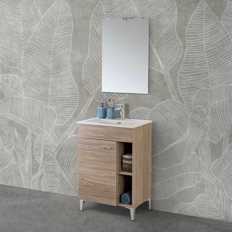 Mobile bagno 82cm da terra in legno melaminico rovere chiaro composto da mobiletto dotato di 1 anta e 3 cassetti con sistema soft-close per una chiusura ottimale, lavabo in ceramica lucida e specchio 70x90 cm reversibile.