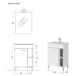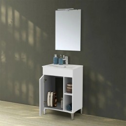 Mobile bagno 55cm a terra in legno melaminico bianco lucido composto da mobiletto dotato di 2 ante, lavabo a incasso in ceramica lucida e specchio 48x57 cm.