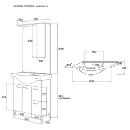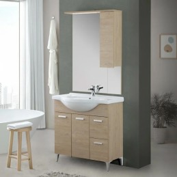 Mobile bagno 55 cm a terra in legno melaminico in Rovere dolomite. Composto da mobiletto con piedini in ABS dotato di 2 ante, lavabo a incasso in ceramica lucida e specchio reversibile.