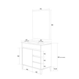 Mobile bagno 82cm da terra in legno melaminico bianco laccato composto da mobiletto dotato di 1 anta e 3 cassetti con sistema soft-close per una chiusura ottimale, lavabo in ceramica lucida e specchio 70x90 cm reversibile.
