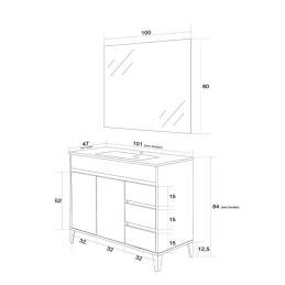 Mobile bagno 102cm da terra in legno melaminico bianco laccato composto da mobiletto dotato di 2 ante e 3 cassetti con sistema soft-close per una chiusura ottimale, lavabo in ceramica lucida e specchio 100x80 cm reversibile.
