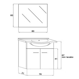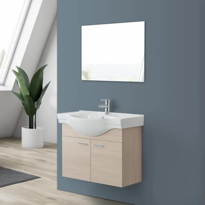 Mobile bagno 81cm sospeso in legno melaminico colore larice composto da mobiletto dotato di 2 ante, lavabo in ceramica lucida e specchio filo lucido reversibile 60x80 cm.