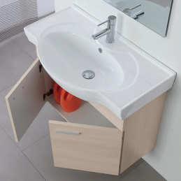 Mobile bagno 81cm sospeso in legno melaminico colore larice composto da mobiletto dotato di 2 cassettoni con sistema soft-close per una chiusura ottimale, lavabo in ceramica lucida e specchio filo lucido reversibile 60x80 cm.