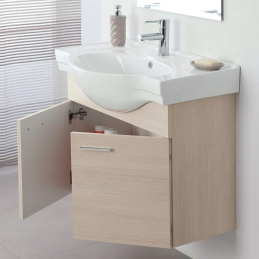 Mobile bagno 55 cm sospeso in legno melaminico di colore Rovere dolomite. Composto da mobiletto dotato di 1 anta con possibilità di apertura a destra o a sinistra, lavabo in ceramica lucida e specchio a filo lucido con montaggio reversibile.