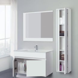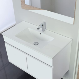 Mobile bagno 90cm sospeso in legno melaminico bianco laccato composto da mobile dotato di 2 ante con sistema soft-close per una chiusura ottimale, lavabo in ceramica lucida e specchio su pannello 90x80 cm.