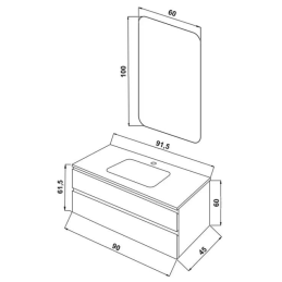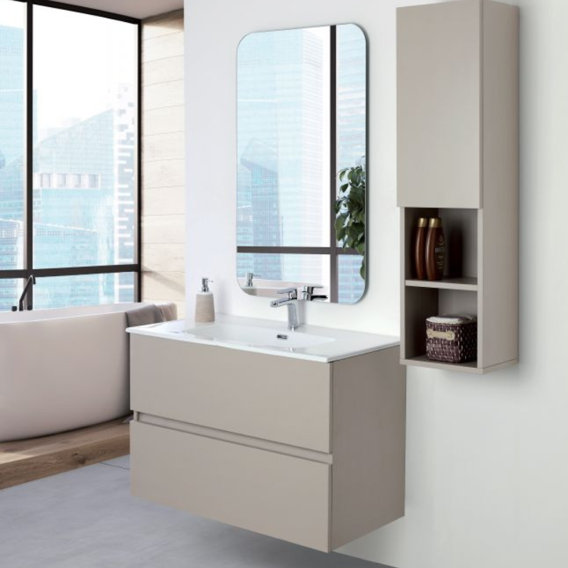 Mobile bagno 90cm sospeso in legno melaminico tortora composto da mobile dotato di 2 cassetti con sistema soft-close per una chiusura ottimale, lavabo in ceramica lucida e specchio su telaio con angoli raggiati 60x100 cm.