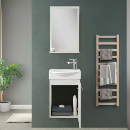 Arriva assemblato, completo di specchio su cornice e mensola portaoggetti. Il lavabo è in ceramica bianca.