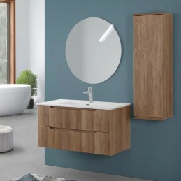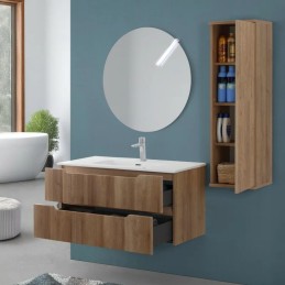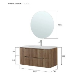 Mobile bagno 100cm sospeso in legno melaminico colore rovere riviera composto da mobile dotato di 1 cassetto con sistema soft-close per una chiusura ottimale, maniglia effetto pietra, lavabo in ceramica lucida e specchio tondo serigrafato su telaio 80cm di diametro. ATTENZIONE PENSILE LATERALE NON INCLUSO, acquistabile separatamente segui descrizione.