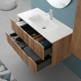 Mobile bagno 81cm sospeso in legno melaminico colore larice composto da mobiletto dotato di 2 cassettoni con sistema soft-close per una chiusura ottimale, lavabo in ceramica lucida e specchio filo lucido reversibile 60x80 cm.